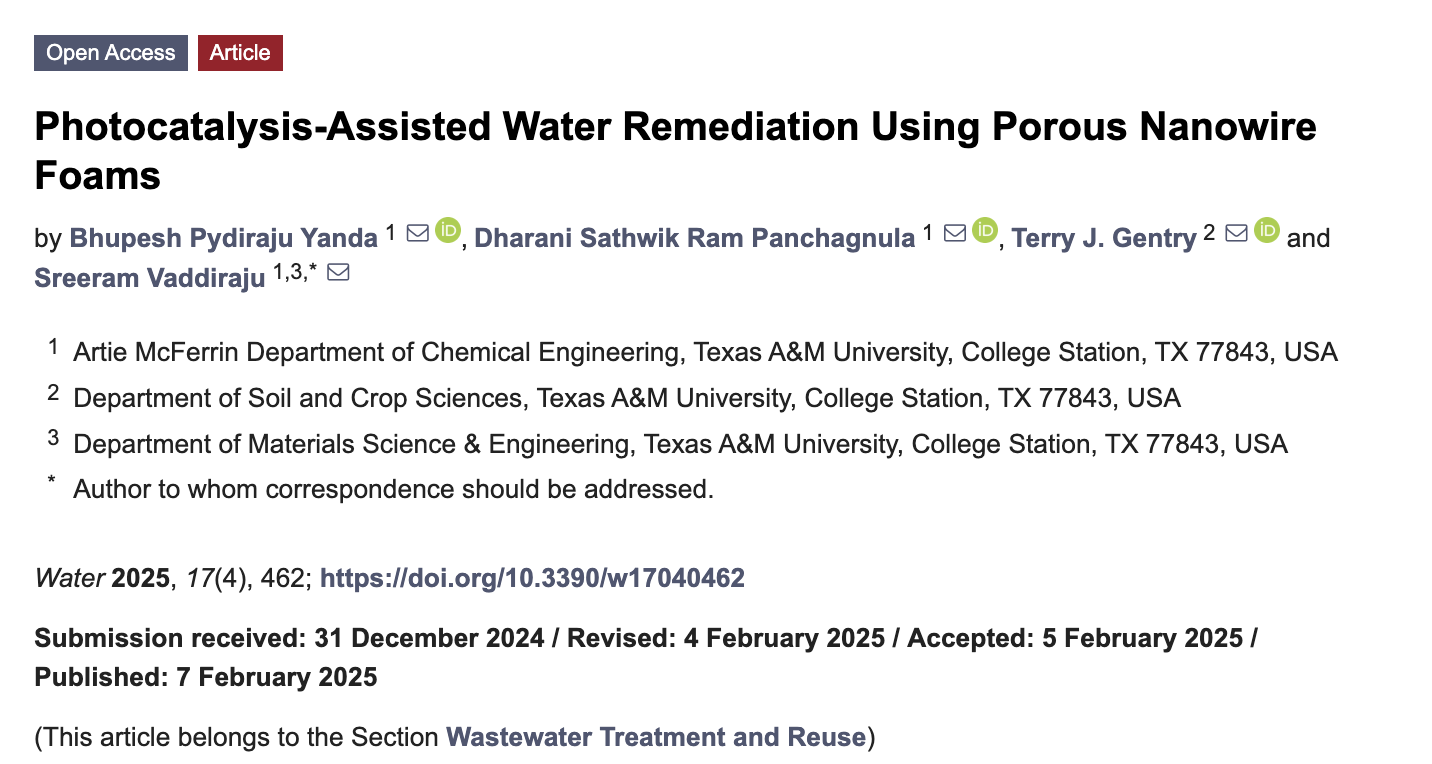 Feb 2025: Bhupesh and Dharani publish their work on Photocatalysis-Assisted Water Remediation Using Porous Nanowire Foams 📄✍🏼